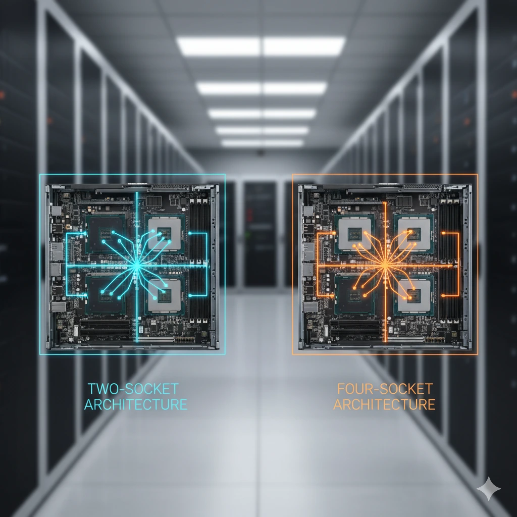سرور دو سوکتی از دو پردازنده فیزیکی بهره می برد و برای بارهای کاری عمومی مناسب است، در حالی که سرور چهار سوکتی چهار پردازنده دارد و برای محاسبات سنگین، شبیه سازی و تحلیل داده طراحی شده است.